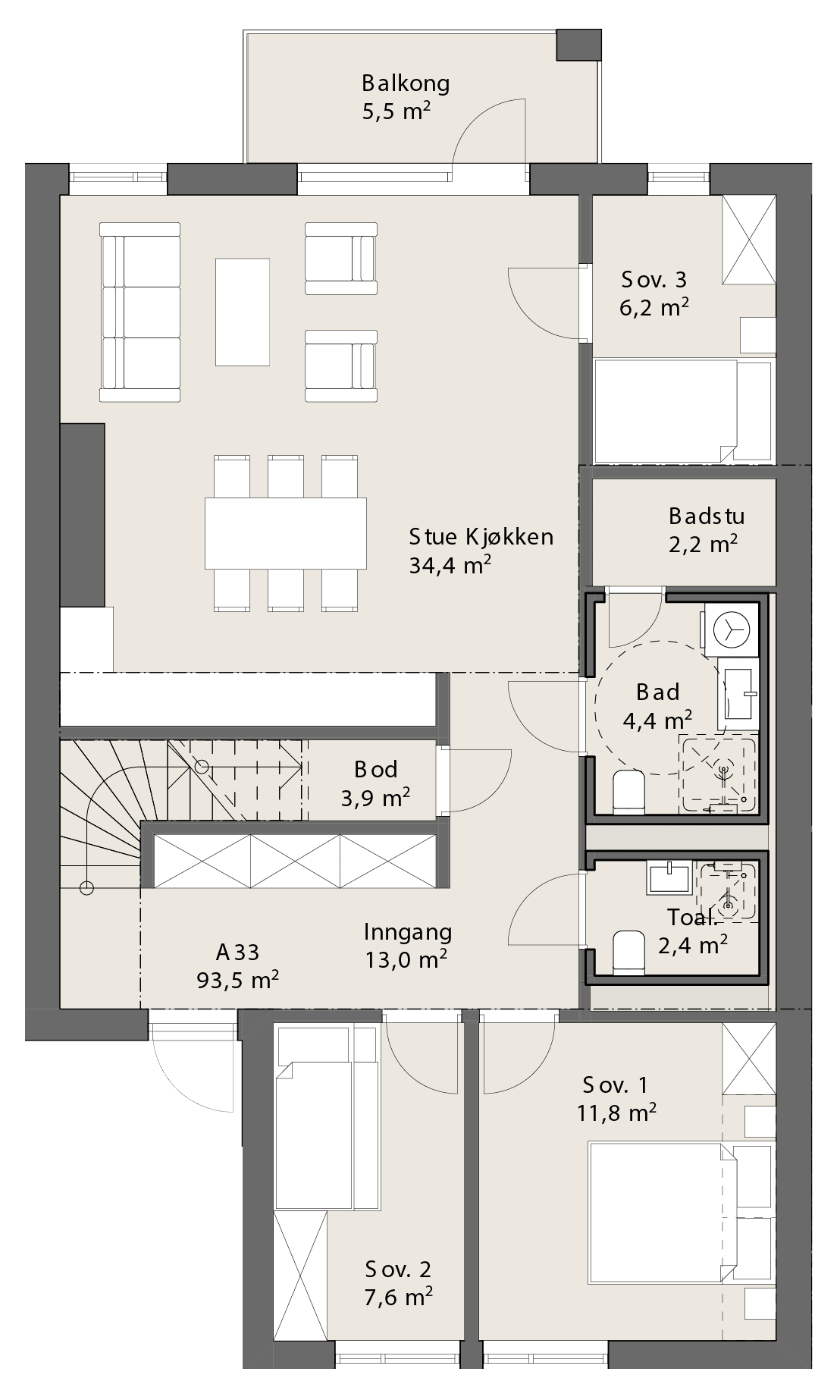 Lekker leilighet med 3 soverom, hems, 2 bad, sauna og romslig kjøkken-/ stueløsning med store vindusflater og god takhøyde.
