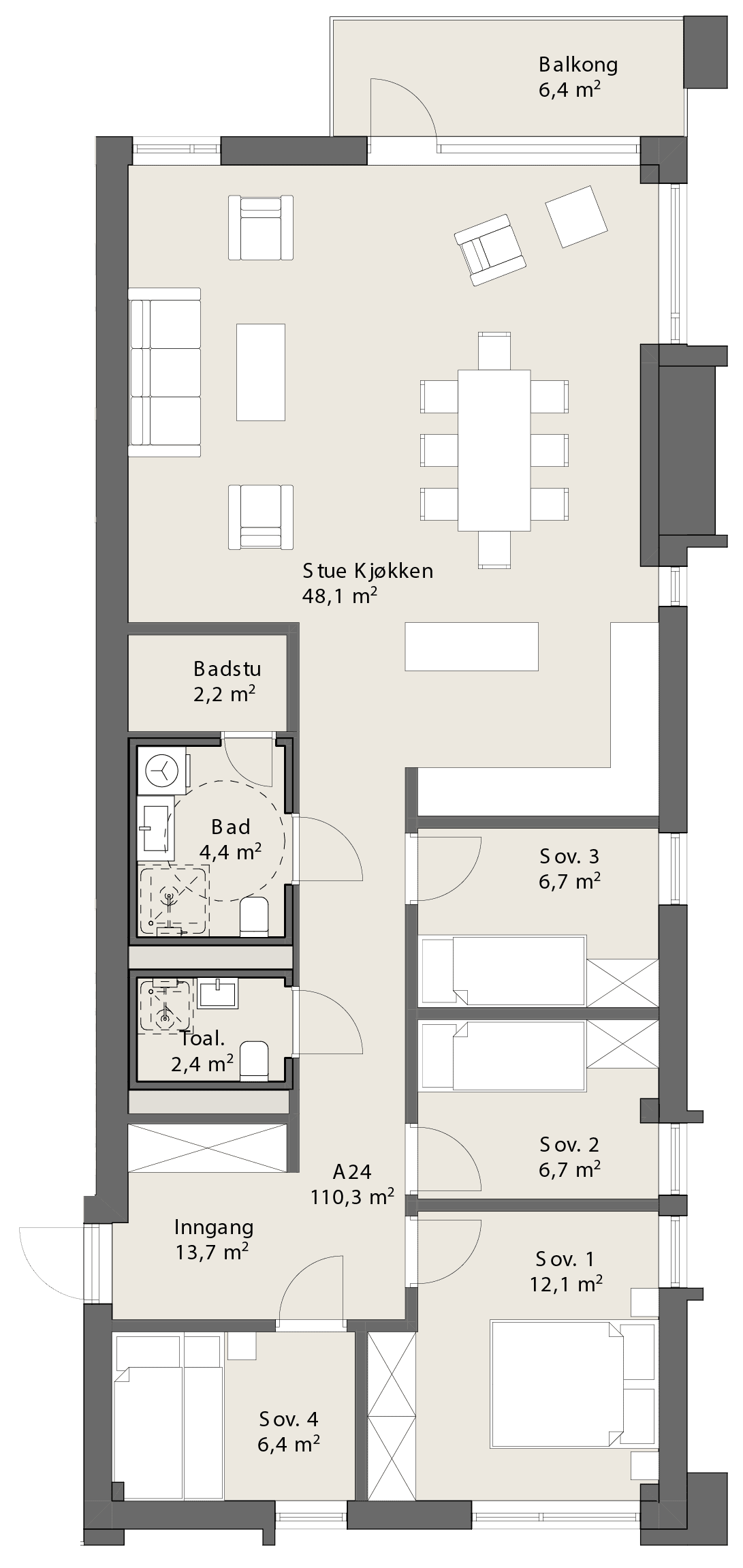 Omfangsrik endeleilighet med 4 soverom, 2 bad, sauna og romslig kjøkken-/stueløsning med store vindusflater.