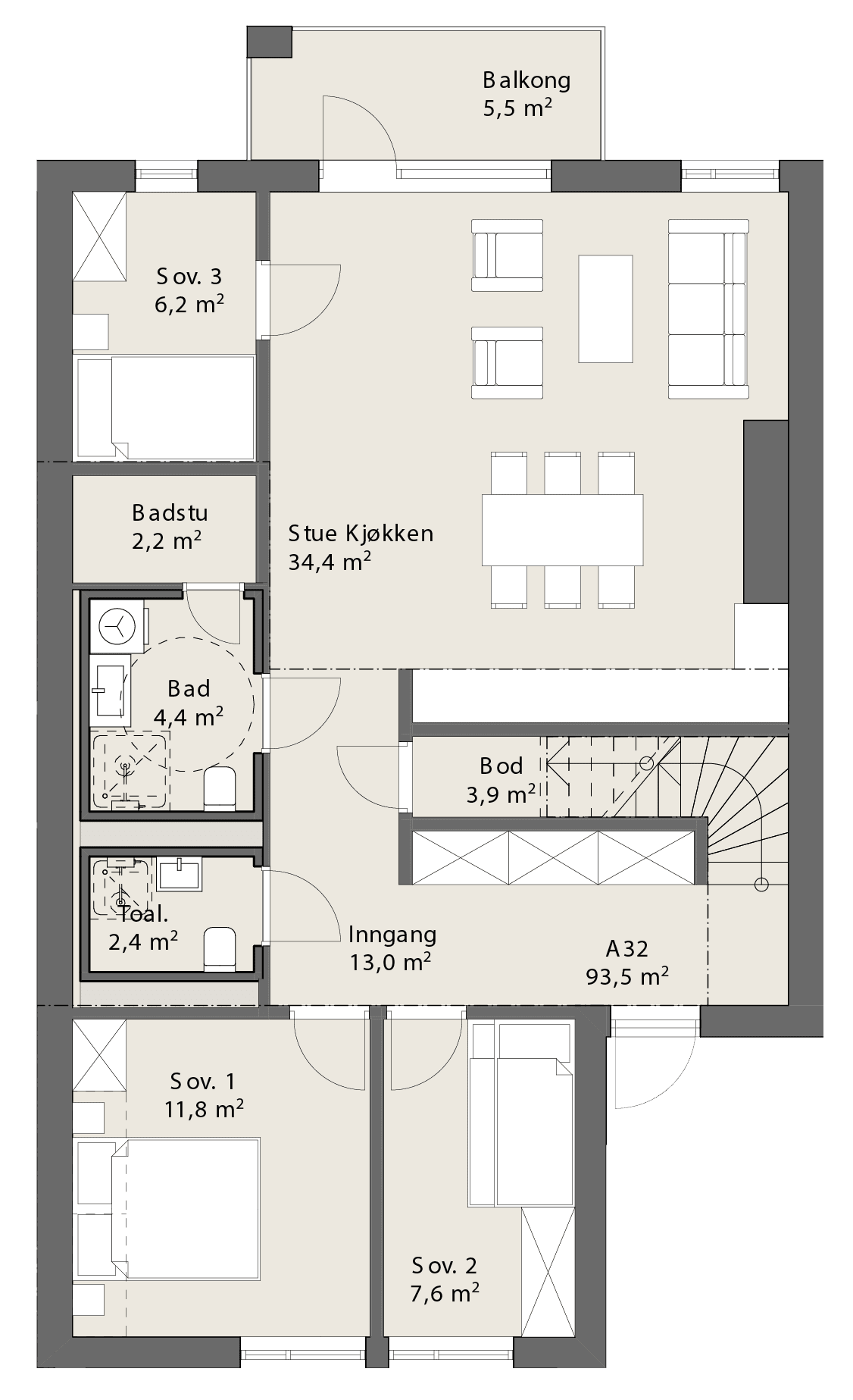 Lekker leilighet med 3 soverom, hems, 2 bad, sauna og romslig kjøkken-/ stueløsning med store vindusflater og god takhøyde.
